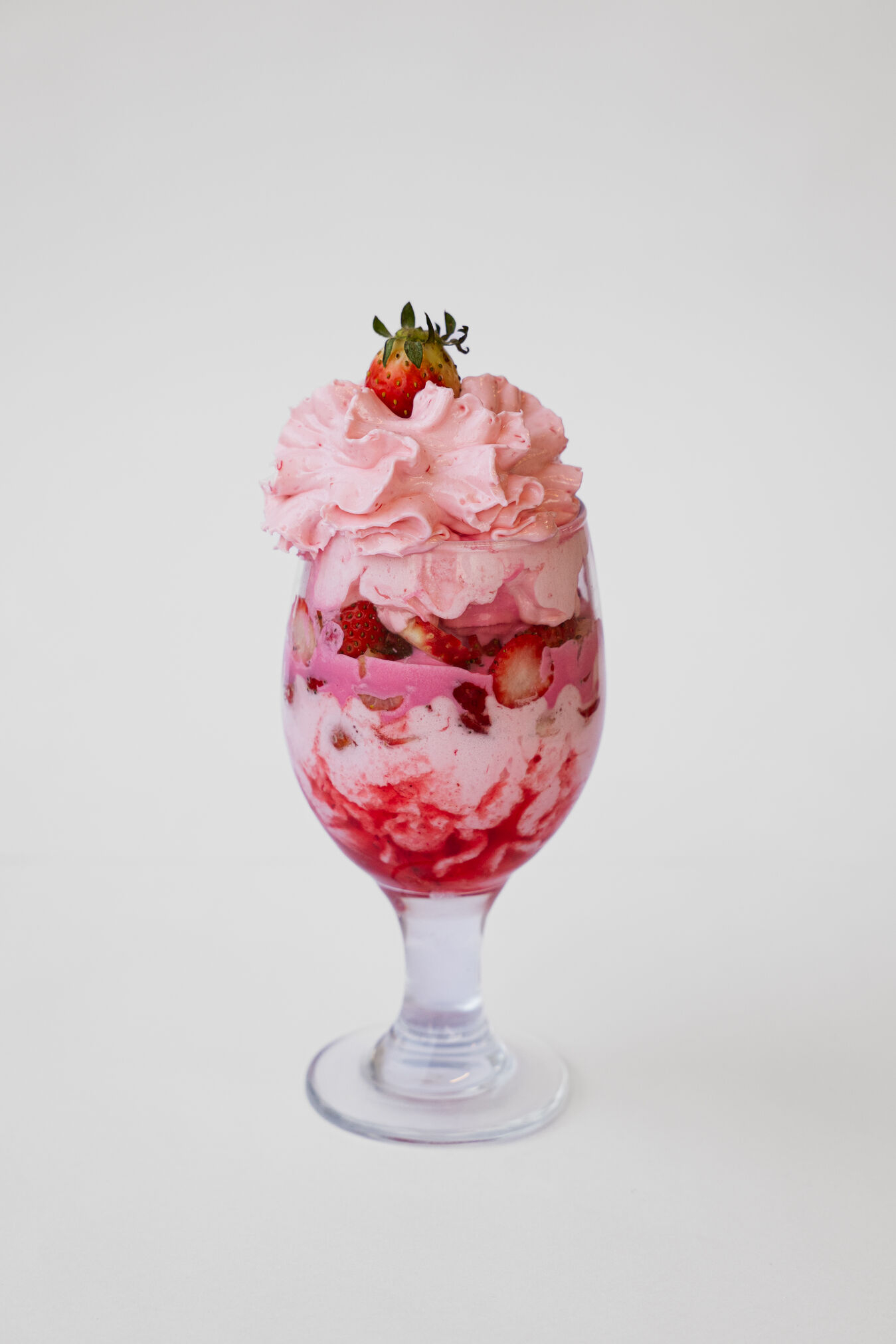 A delightful blend of fresh strawberries and rich cream, topped with a strawberry.
